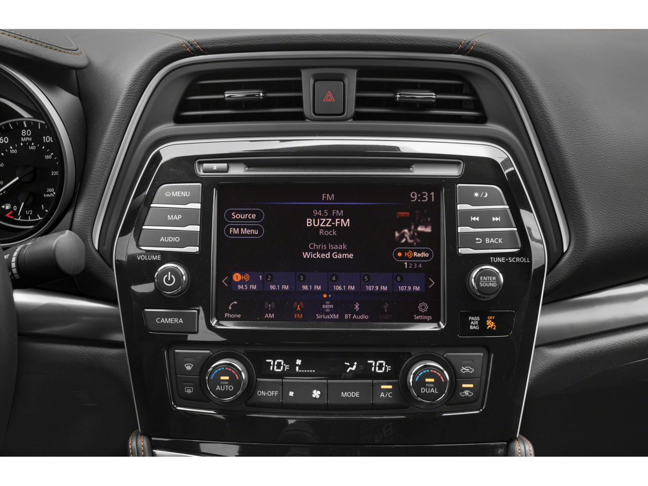 - Radio: AM/FM/CD Audio System w/Navigation -inc: MP3/WMA reader, NissanConnect w/navigation featuring Apple CarPlay and Android Auto, 8" color display w/multi-touch control, 2 front illuminated USB connection ports (1 Type-A, 1 Type-C) for iPod interface and other compatible devices, Bluetooth® hands-free phone system, streaming audio via Bluetooth®, hands-free text messaging assistant, SiriusXM satellite w/advanced audio features, auxiliary audio input jack, Nissan door to door navigation w/3D building graphics and satellite imagery, connected navigation features including online POI search, door-to-door navigation, and online premium traffic information, HD radio, SiriusXM Travel Link (weather, fuel prices, movie listings, stock info, sports and parking), SiriusXM Traffic, 11 speaker Bose sound system and 2 rear illuminated USB charge ports (1 Type-A, 1 Type-C)